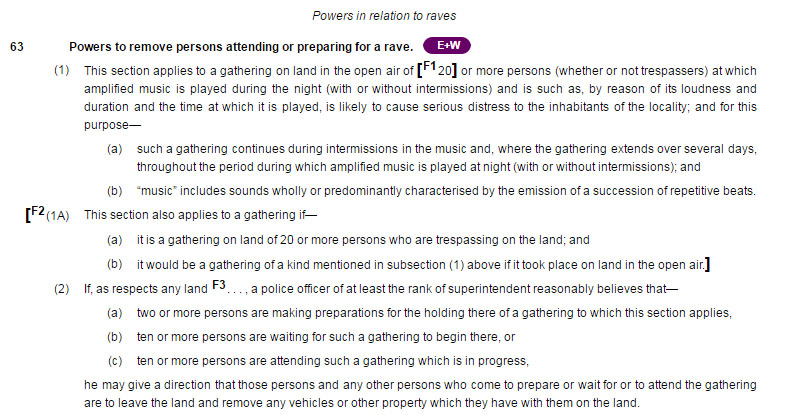In 1993, a new bill was put to parliament, The Criminal Justice Bill. Section 63 of the new legislation featured a clause which allowed police to shut down events that were “characterised by the emission of a succession of repetitive beats.”