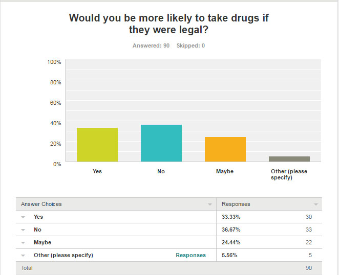 Contrary to the government’s fears of more people taking drugs if they were legally manufactured, a 36.67% majority said they would not be more inclined to take drugs if they were made legal.