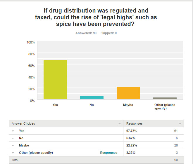 In fact, 67.78% believed that if drug distribution was regulated and taxed, the rise of ‘legal highs’ such as spice could have been prevented.