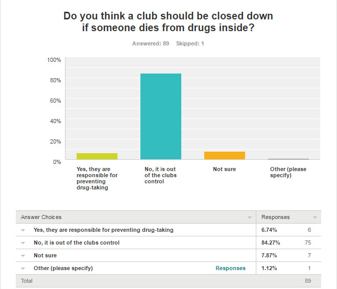 Significant to the Fabric scenario, 84.27% of participants believed a drug-related death to be out of a clubs control, and that they should not face prosecution because of it.