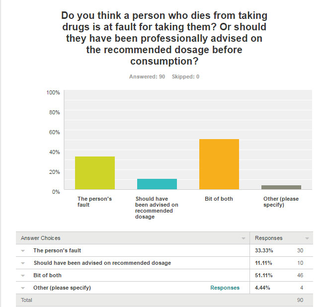 Finally, 51.11% believe that when a person dies from taking drugs, it is both their fault and the fact that they should have been professionally advised on the recommended dosage, with one respondent saying: “I believe that the government and the legislator are at fault for innocent deaths at the hands of “party drugs”, were they regulated and produced in a controlled environment then deaths would be few and far between, alcohol and tobacco accounts for ample more deaths than party drugs such as ecstasy.”